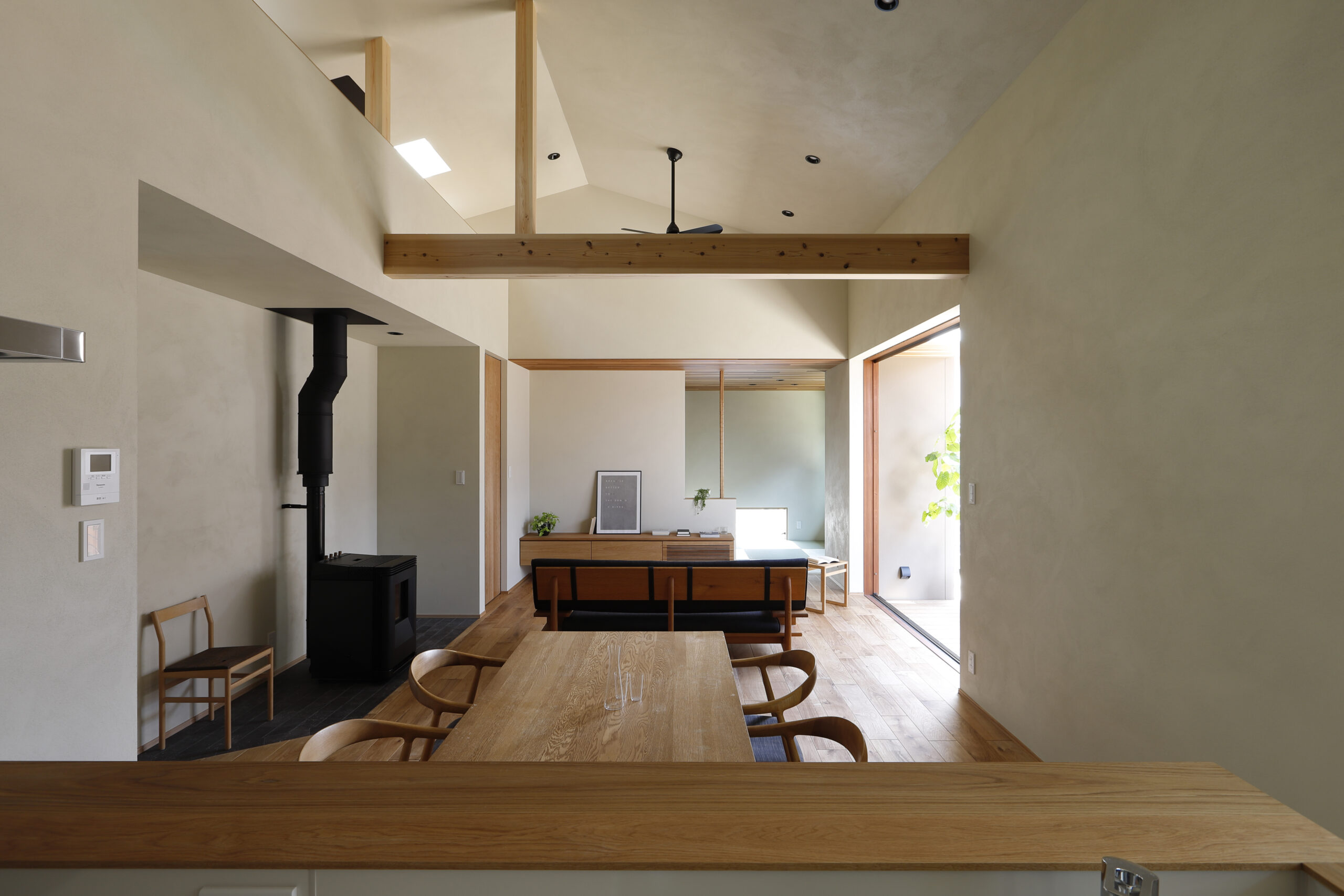 勾配天井は広く開放感ある空間をつくるとともに、どこの部屋にいてもお互いの気配を感じることができるのが平屋の家です。