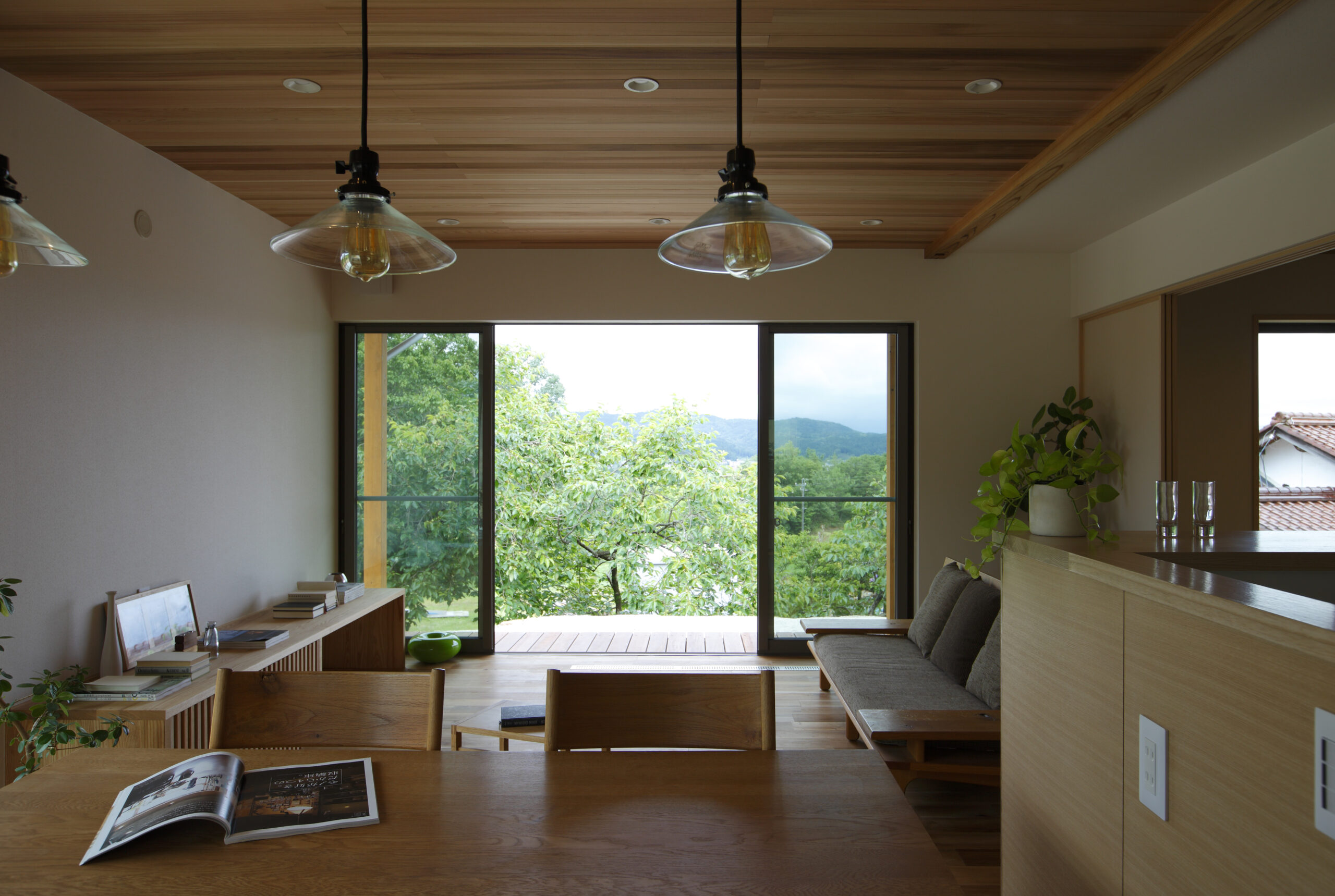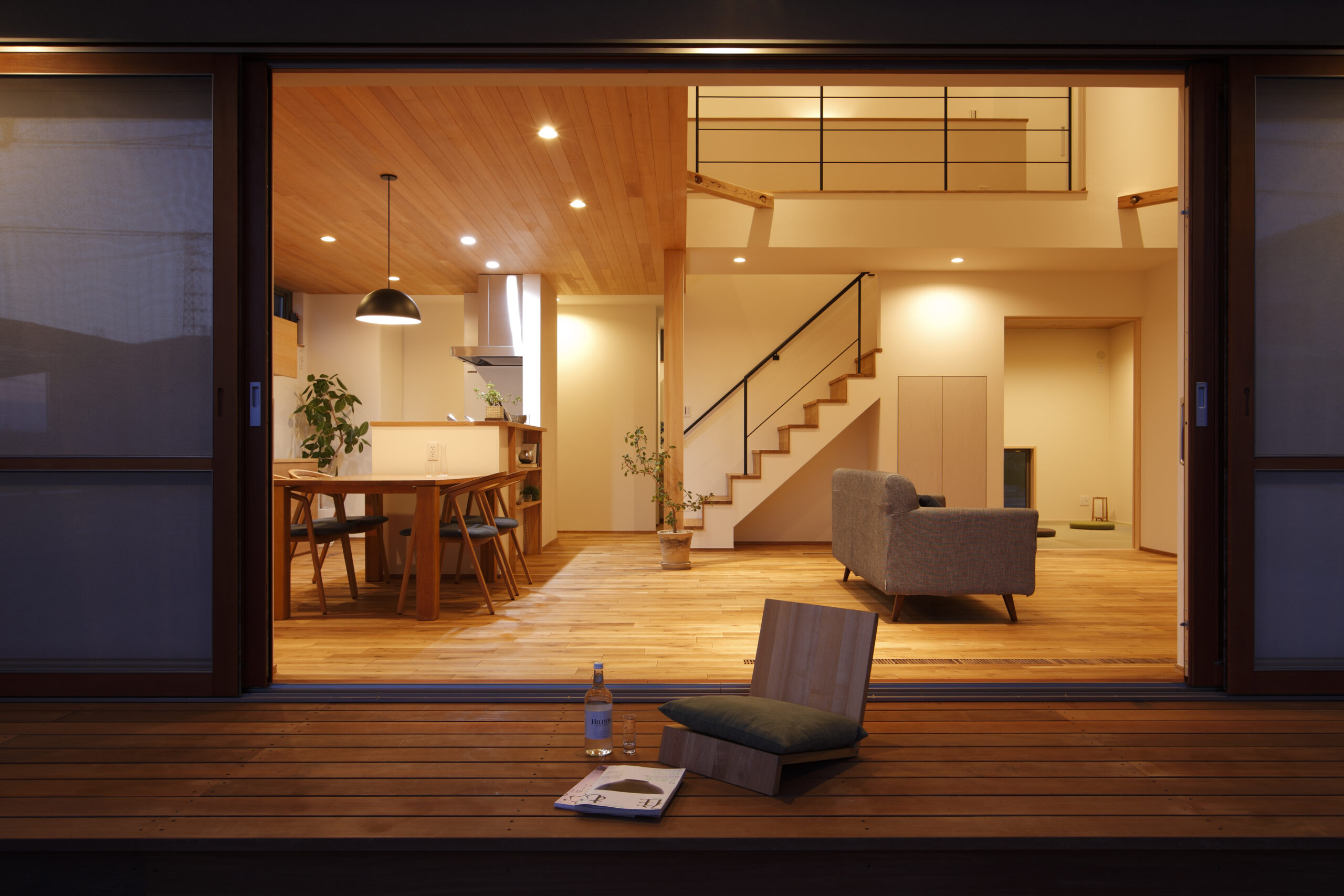壁一面を大きな窓にし、屋内の床がそのまま屋外のウッドデッキに続く。窓を開ければ、まるで屋外と一体化した開放感のある空間を楽しむことができます。