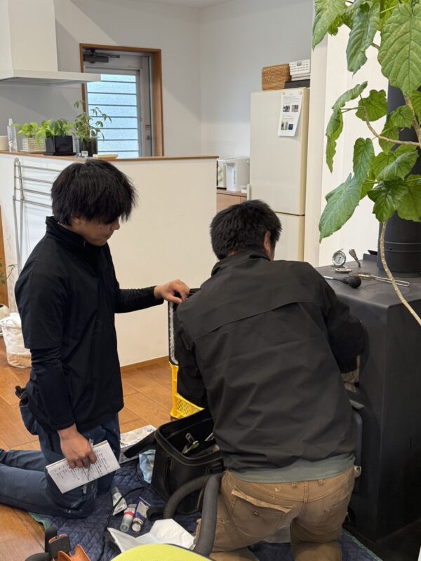 先日、可児工房事務所の薪ストーブを清掃いたしました。日頃から薪ストーブのメンテナンスを担当している大工の井上さんにご指導いただきながら、煙突まわりやストーブ内部の清掃を行いました。