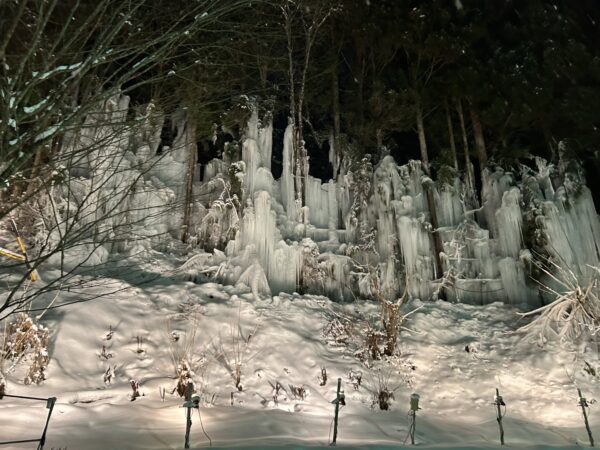泊まった旅館のすぐ目の前に氷瀑(氷の滝)ができており、自然のスケールの大きさを体感してきました。本来なら山奥の滝で見られるようですが、山水をホースで流し、半人工的に麓でも見れるように、地元有志で毎年行っているようです。
