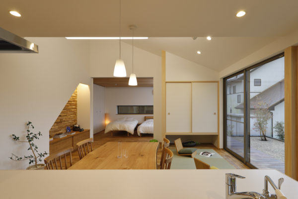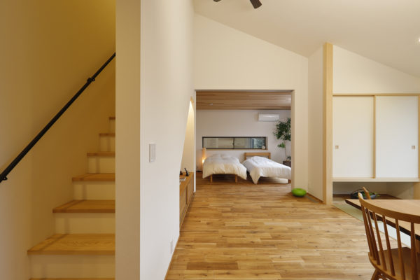 斜め天井を使った吹き抜けは、空間が広く見えるための工夫です。