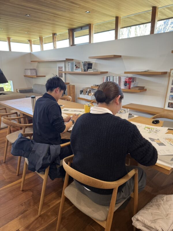 現在は各部署で仕事の体験や説明を行っていますが、設計では平面プランの色塗りに挑戦してもらいました。