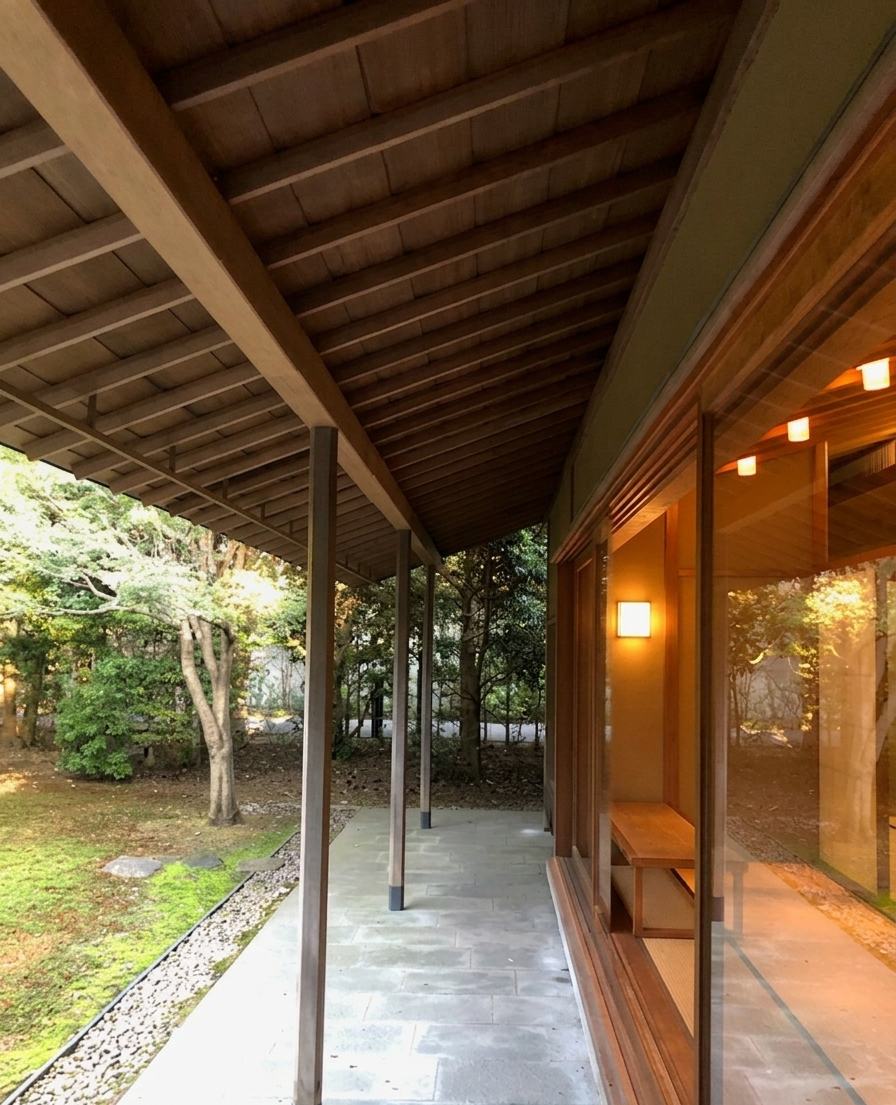 深い軒: 低く抑えられた深い軒が、視線を自然と水平方向(庭の緑)へと導き、