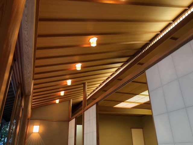 立礼席(椅子席)の天井を見上げると、まず目に飛び込んでくるのが六角形の照明です。