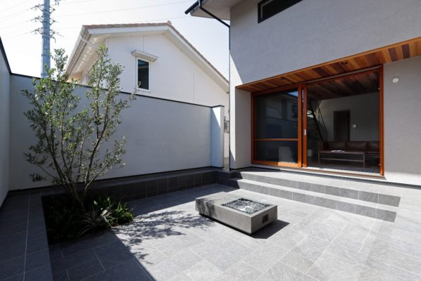 LDK、主寝室とつながった庭はタイルで仕上げています。周囲を壁で囲み、周りからの視線を気にせずゆっくりと過ごしていただける空間をつくりました。