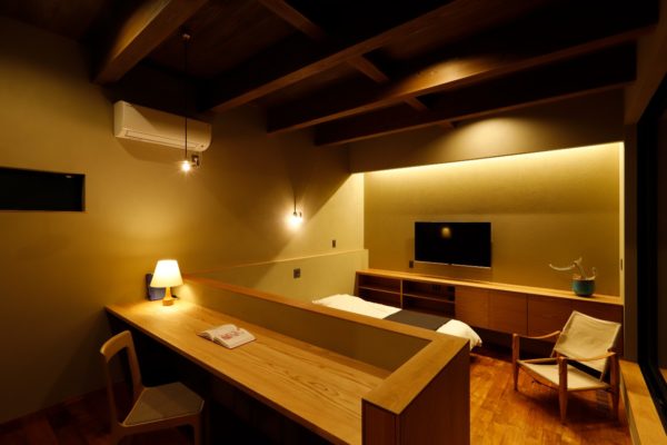 カウンターとベッドを置くスペースについては、床の高さを変えることで空間を分け、しっかりとリラックスできるよう工夫しています。