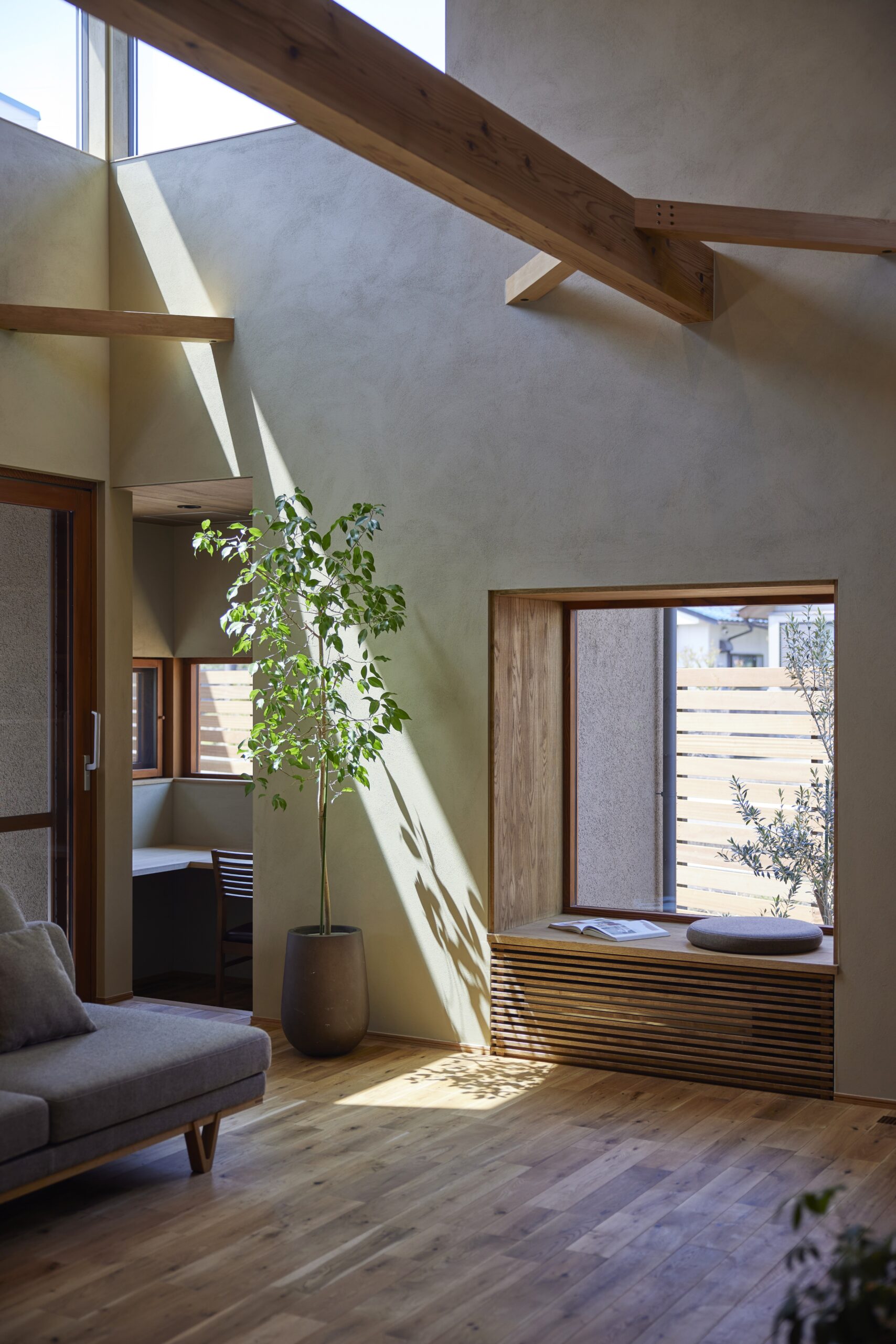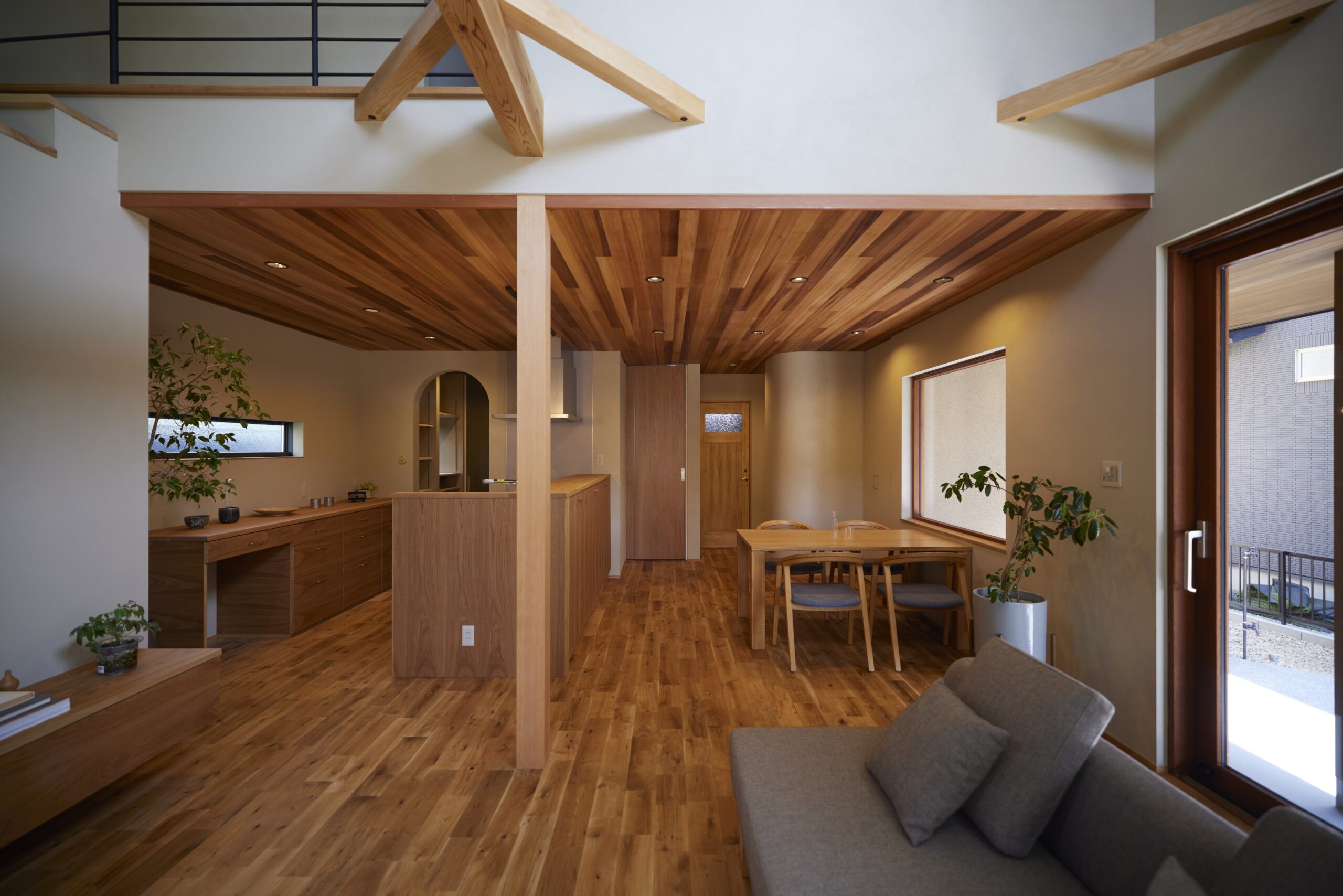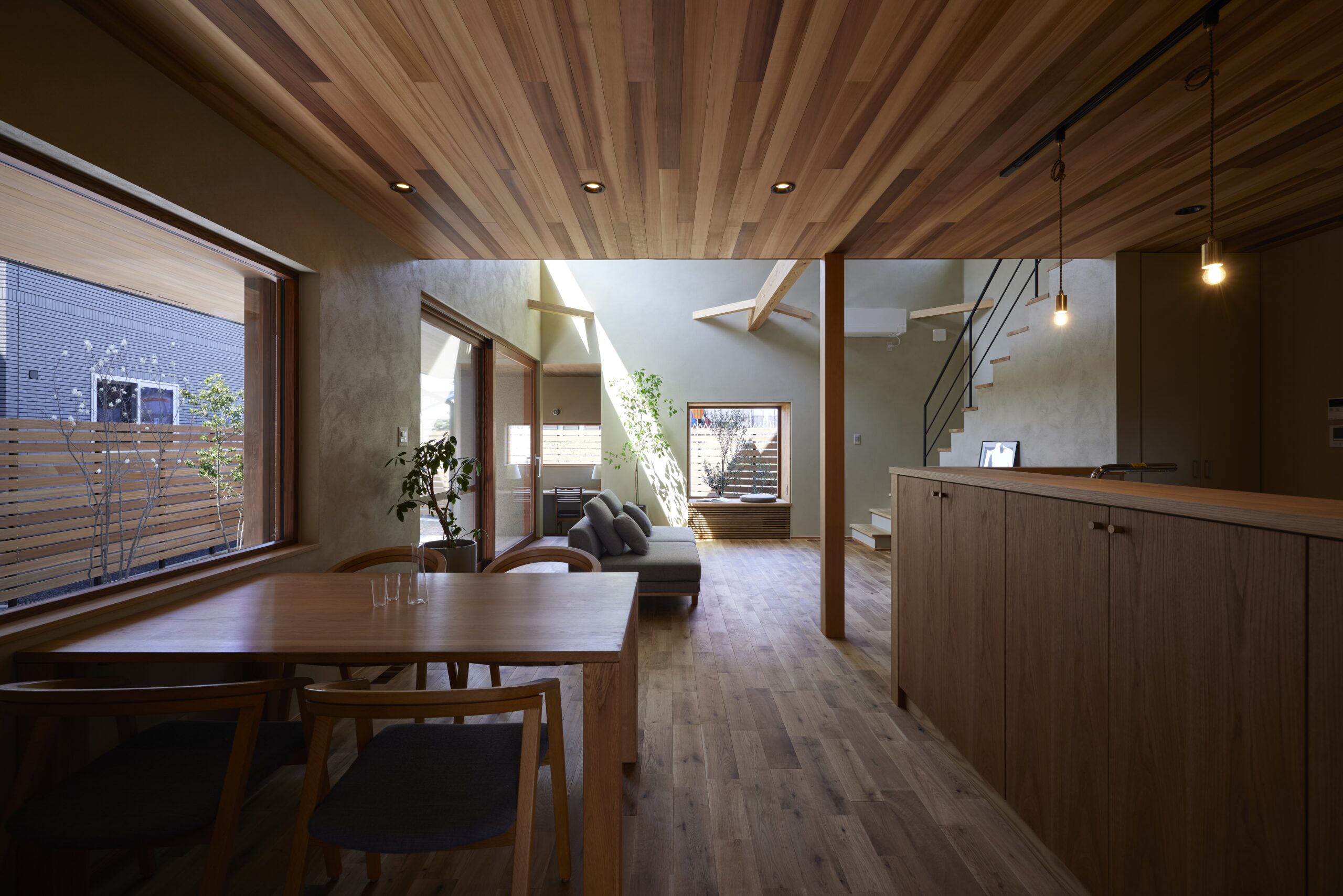 ・家族が集まるダイニングテーブルの横には大きな木製の窓を設け、自然を感じながら食事ができるようにしました。