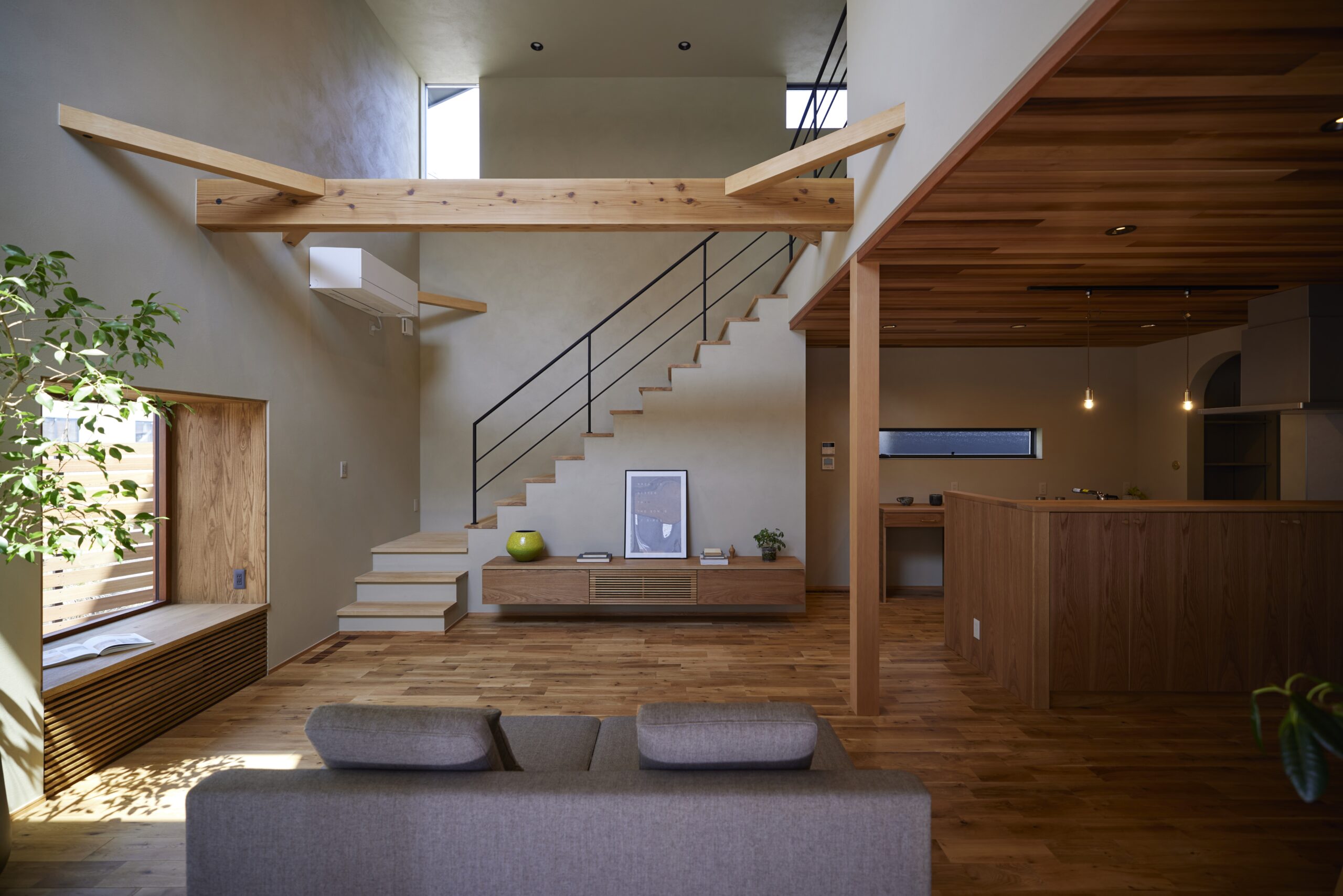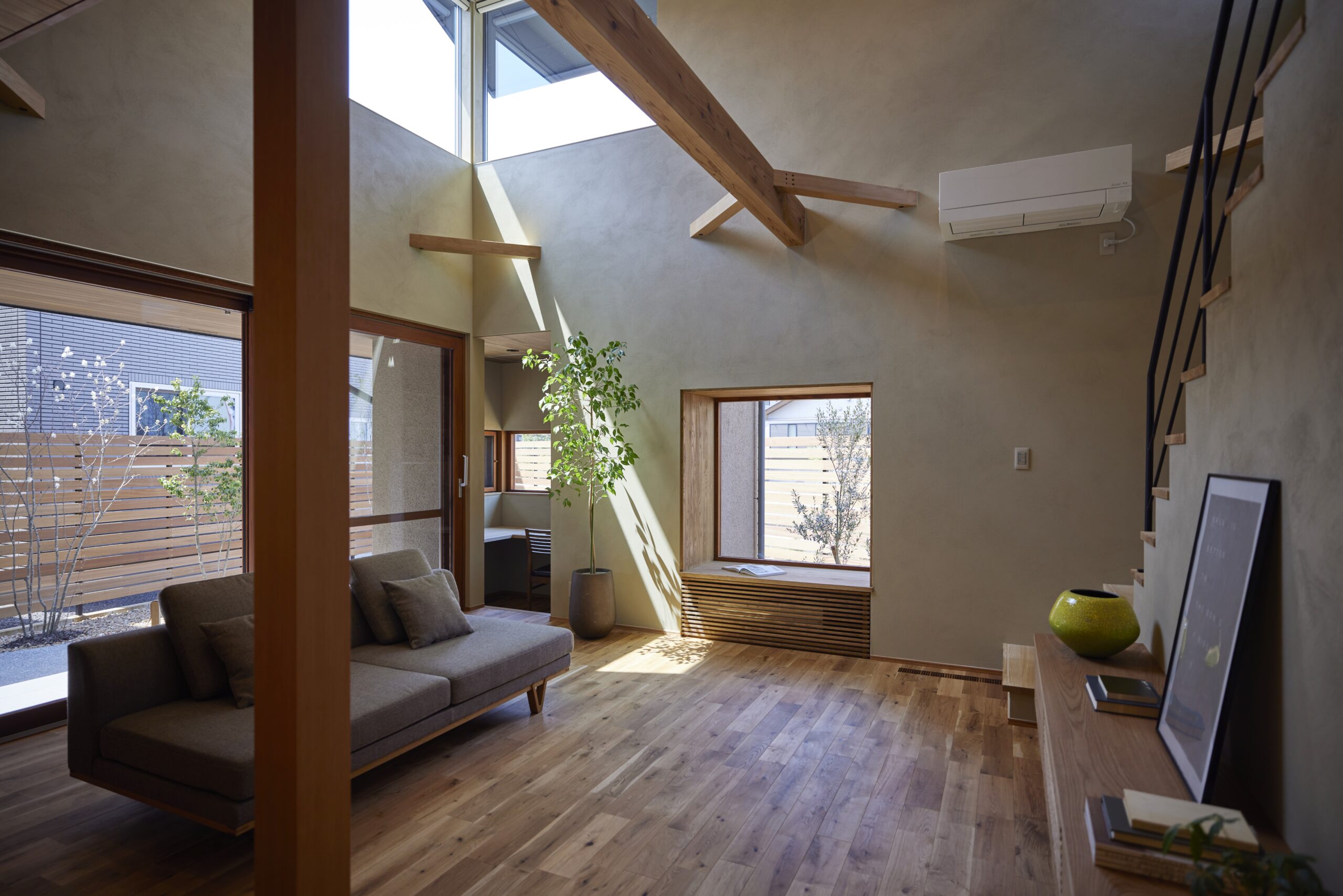・木製の大きな窓と、吹抜けのある明るいリビングは開放感たっぷりです!