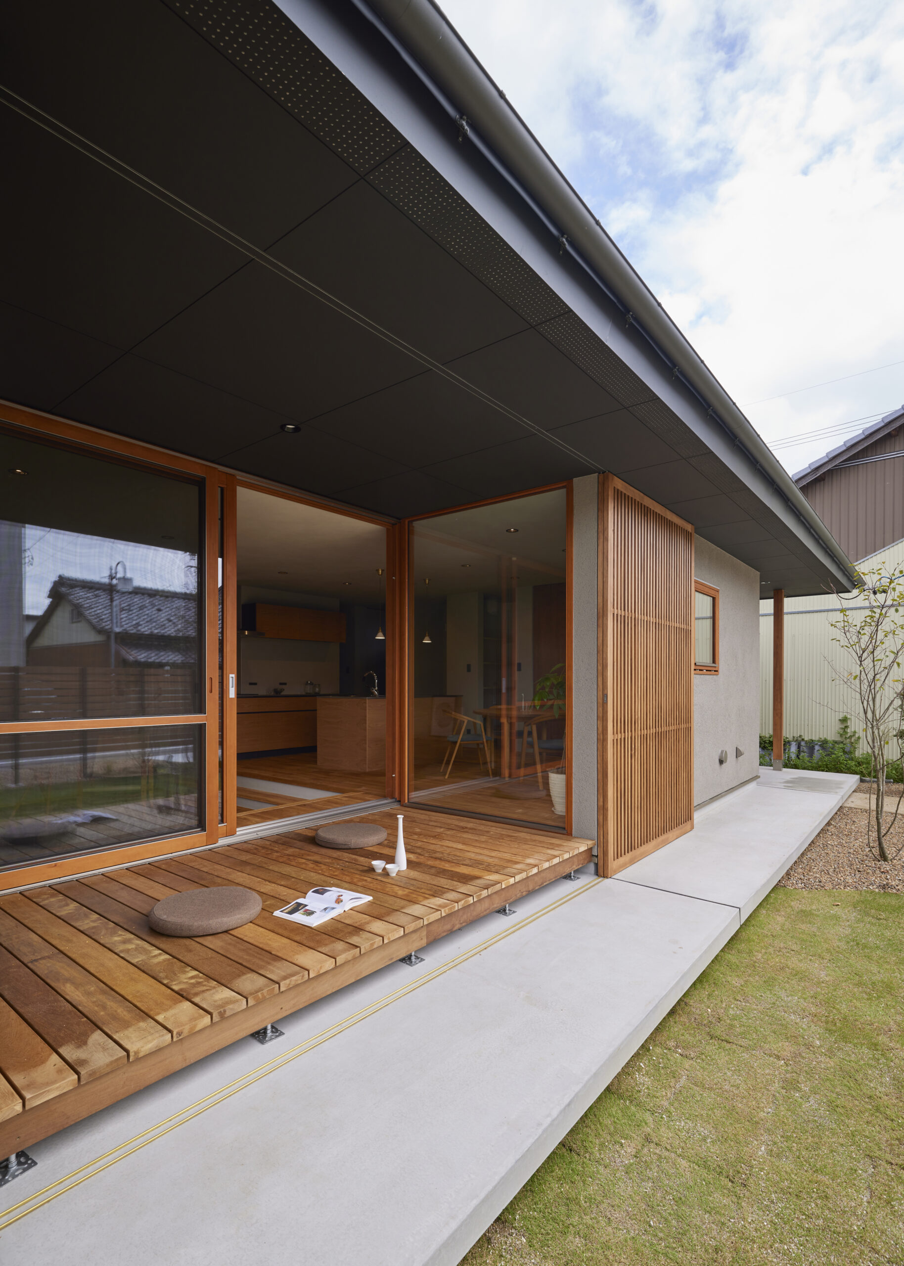 格子戸でデッキを囲うことでプライベートな空間を作り、