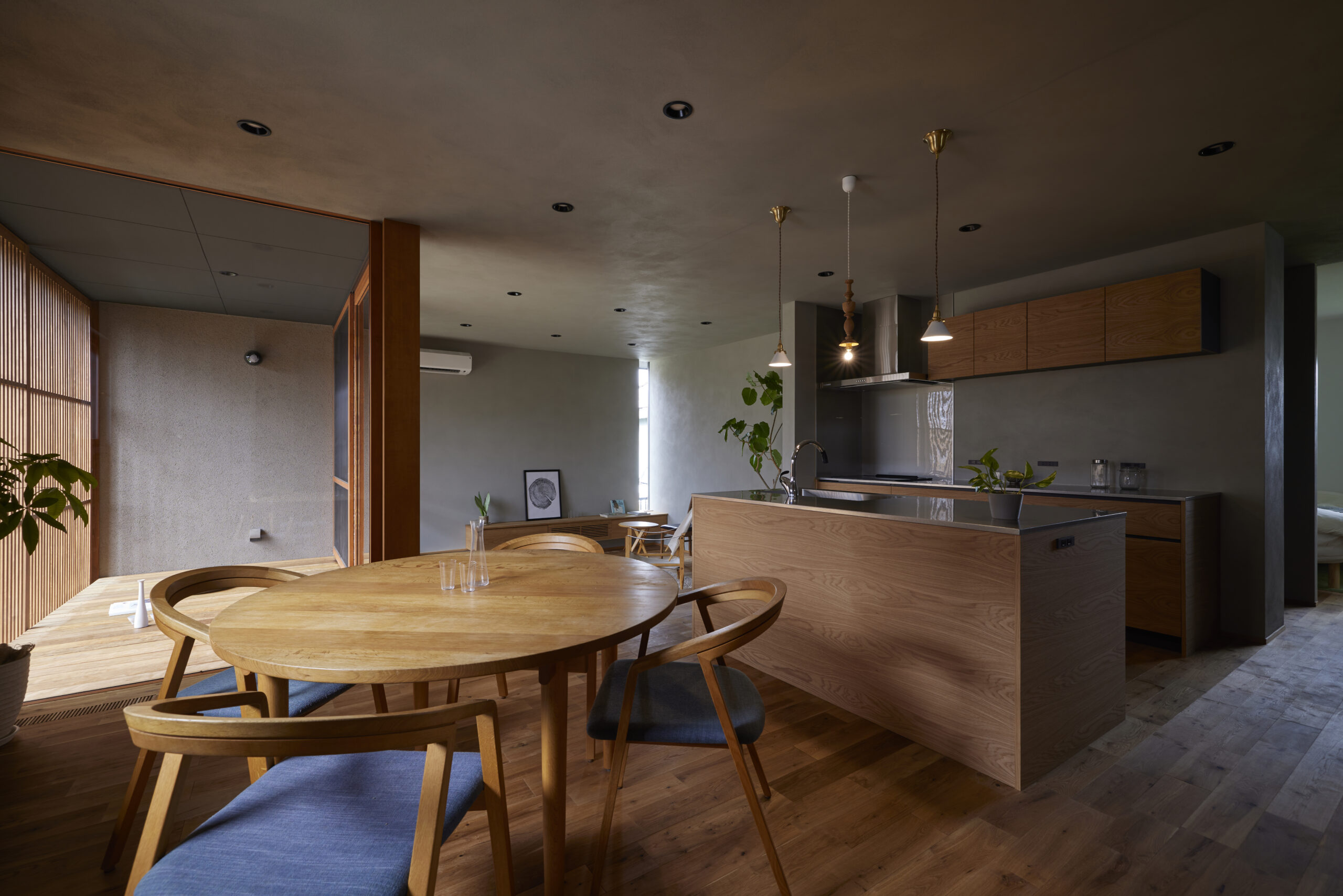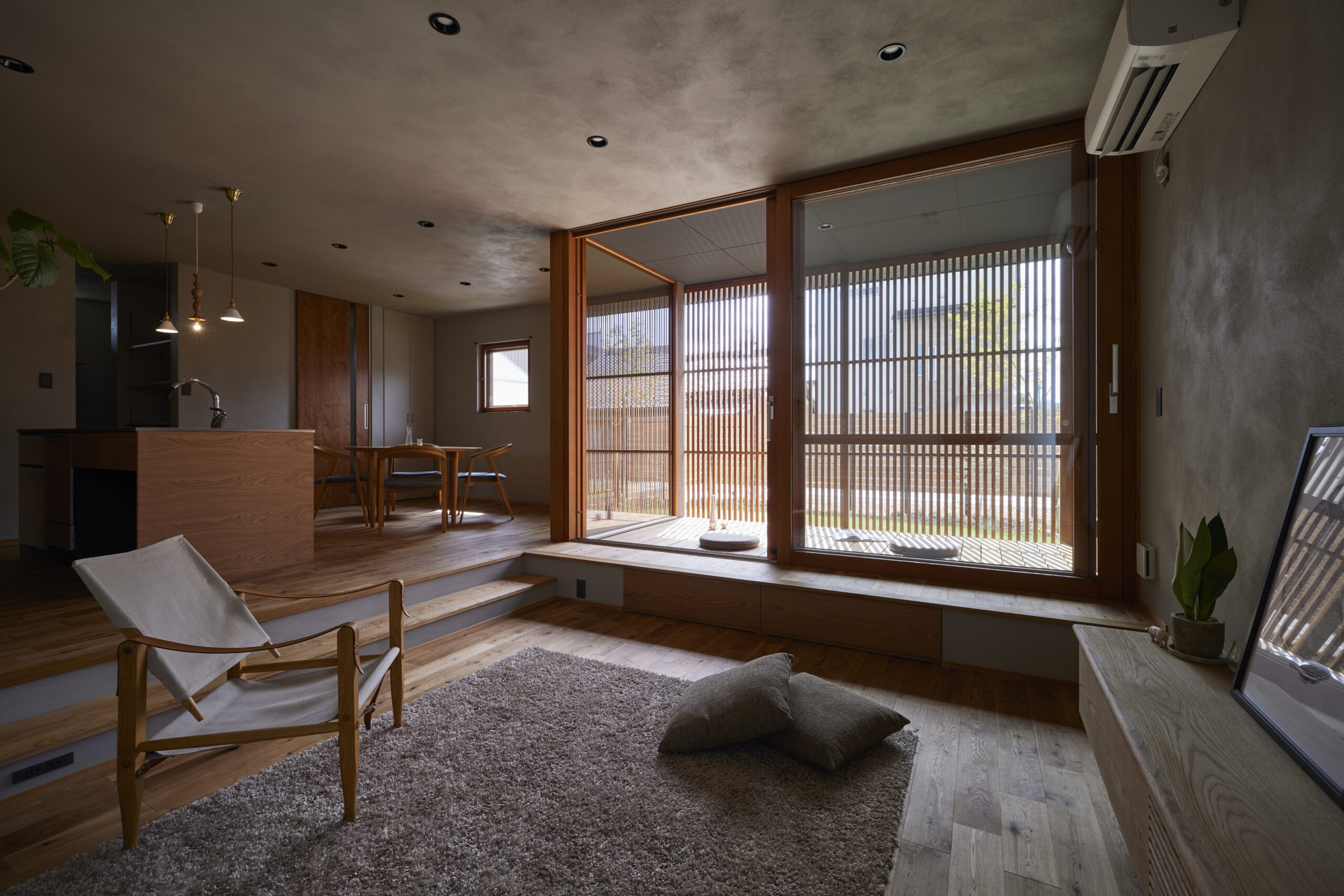 リビングを1段下げたダウンフロアにして個室感を作りながらも、