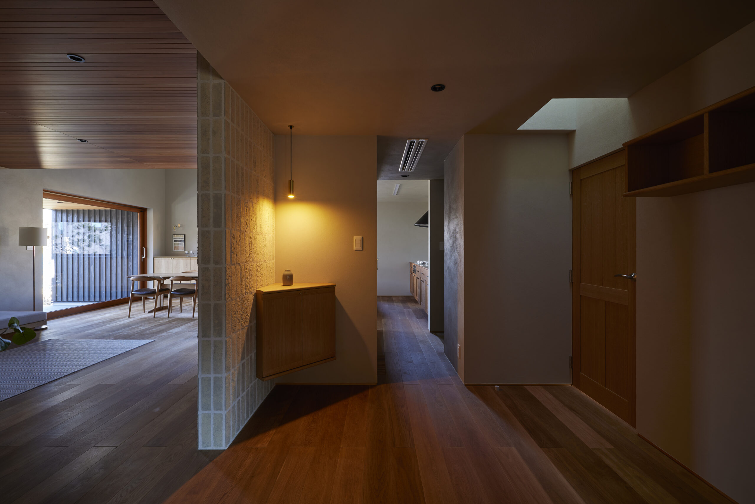 リビングには、素材感を際立たせたブロックタイルの壁がアクセント。薪ストーブの柔らかな炎が、空間全体に温もりと心地よさを広げます。あえて大きな窓を設けず、自然光を程よく取り込むことで、外界から遮断された、安らぎに満ちたプライベートな空間を実現し、穏やかな時間が流れるリビングにしました。