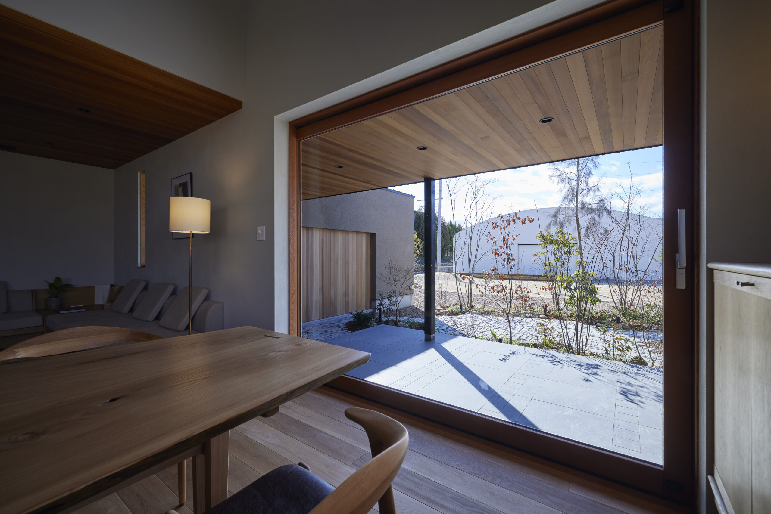 軒が深くかかったテラススペースを介して、室内と外の境界線を曖昧にし、大きな窓を開ければ、室内に風が通り抜け、自然の光がたっぷりと降り注ぎます。まるで室内が庭に溶け込むような、一体感のある空間が広がります。